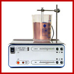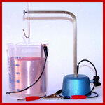 Niezależny statyw może być ustawiony swobodnie na powierzchni stołu. Zawieszka anodowa z drutu miedzianego mocowana jest w zacisku na ramieniu statywu. Pojemnik nietłukący o poj. 500ml zawiera cylindryczną miedzianą katodę. Katoda i statyw posiadają wyprowadzenie elektryczne zakończone wtykami bananowymi (średnica 4mm). Dodatkowy klips krokodylek, pasujący na wtyk bananowy może ułatwić przyłączenie przewodu do aparatu zasilającego. Maksymalny prąd: 5A